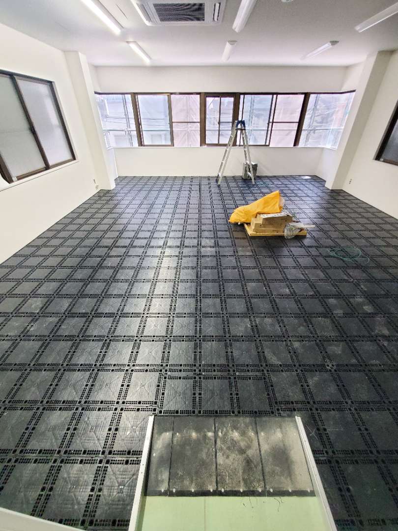 通路・階段部分にフロアカーペットを敷き詰めました。見ためだけでなく防音対策になります。部屋内床にはタイルカーペットです。部分的に交換が可能で、床下の配線メンテナンス時にも必要な部分のみ取り外し作業することができます。